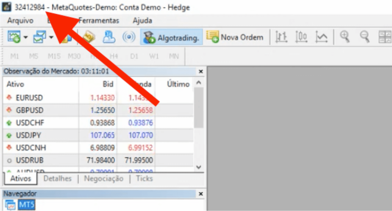 Ao abrir o Meta Trader 5, verifique o número que aparece no canto superior a esquerda, conforme imagem abaixo: